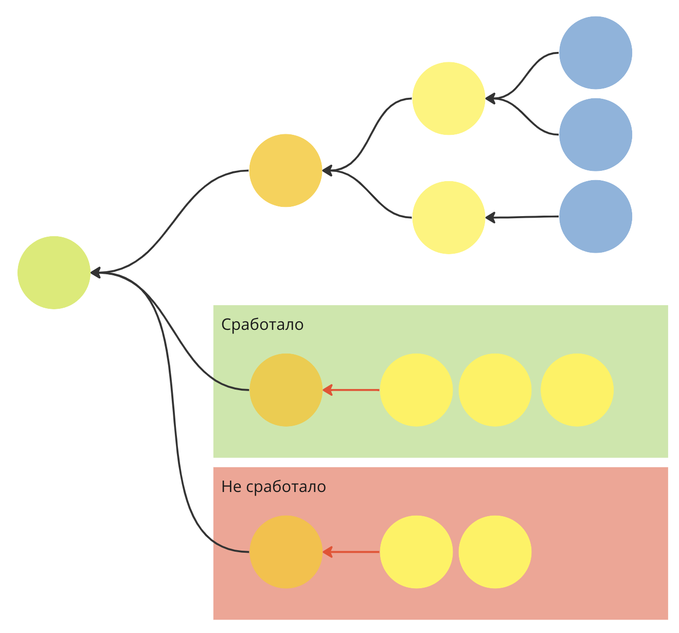 По мере реализации задач у вас формируется знание о том, какие из запланированных гипотез сработали, а какие не сработали. Это полезные знания для бизнеса, поэтому их тоже стоит визуализировать, причём на той же карте. В книге о Карте гипотез, в главе «Вас не догонят», рекомендуется прямо на Карте гипотез цветом отмечать все проработанные пути — как со знаком плюс (зелёным), так и со знаком минус (красным):