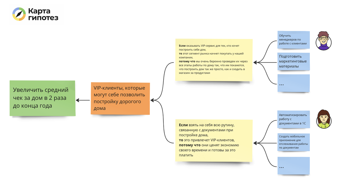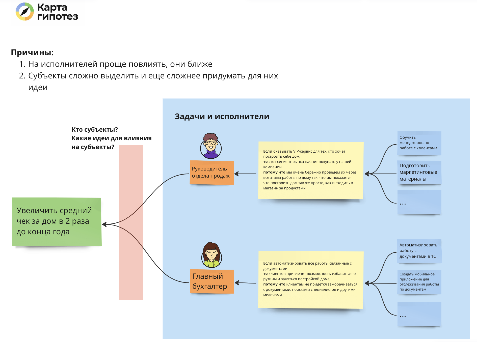 При этом очевидно, что для достижения целей нужно влиять не на собственных сотрудников, а на кого-то извне, кто принесет деньги за услугу по строительству дома. Например, это могут быть VIP-клиенты, которые готовы платить в 2 раза больше. Если в субъекты записать их, то и гипотезы мы начнем формулировать для них, а исполнители при этом переедут на свое место в область задач: