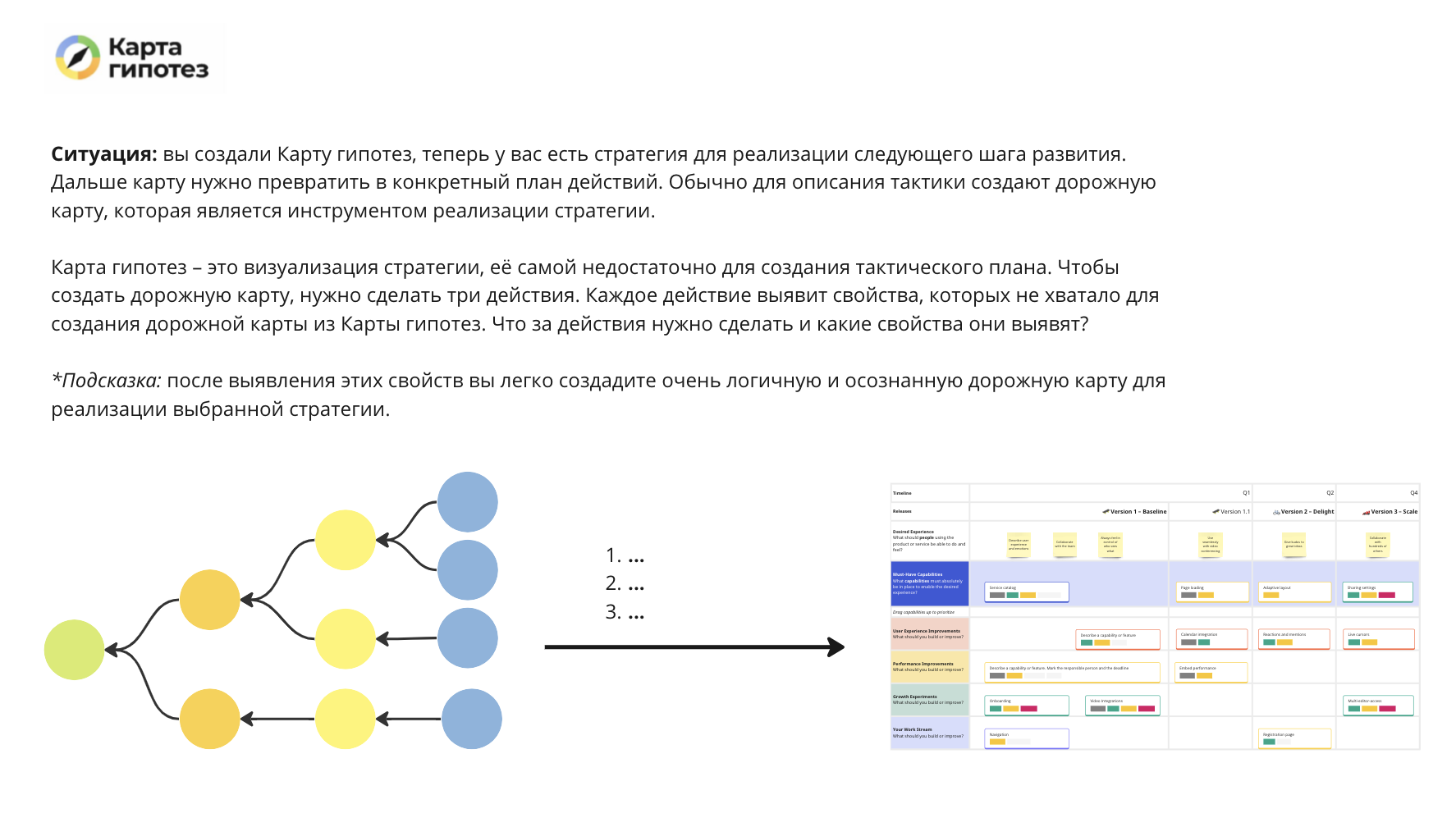Попробуйте для начала сами подумать над этой задачей. Эти размышления и выводы из них пригодятся вам на практике. В любом случае вам же надо будет как-то от стратегии переходить к тактике, то есть от Карты гипотез к дорожной карте, поэтому навык из этого видео будет очень полезен.