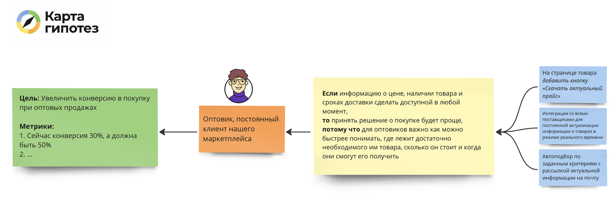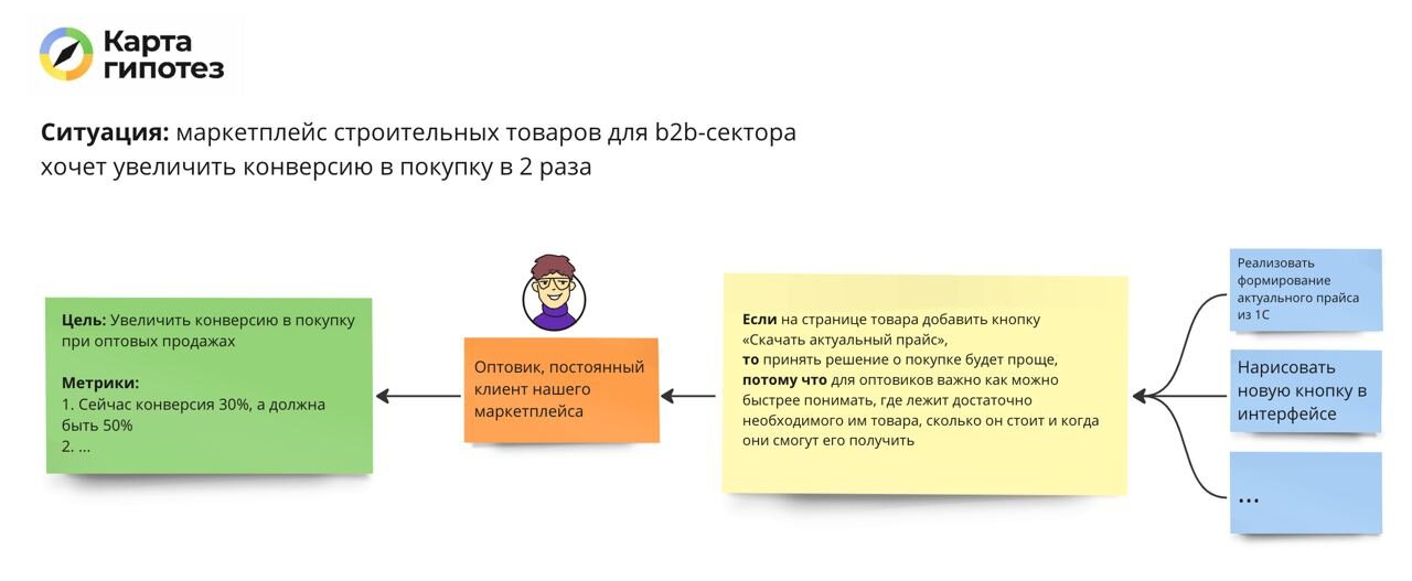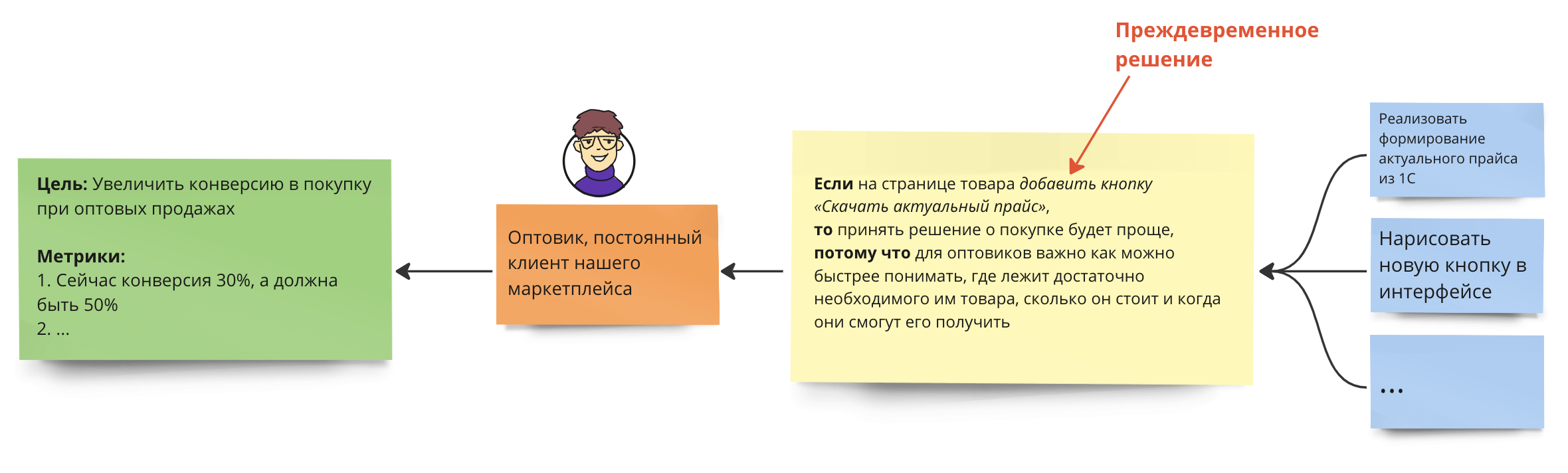 Аналогичная ситуация с примером про оптовиков. В нём в гипотезе поспешно написали, что будут решать проблему клиентов добавлением кнопки. Если такую формулировку оставить и начать работать с этой гипотезой как есть, то будет очень сложно придумать другие, возможно, более подходящие решения проблемы оптовиков.