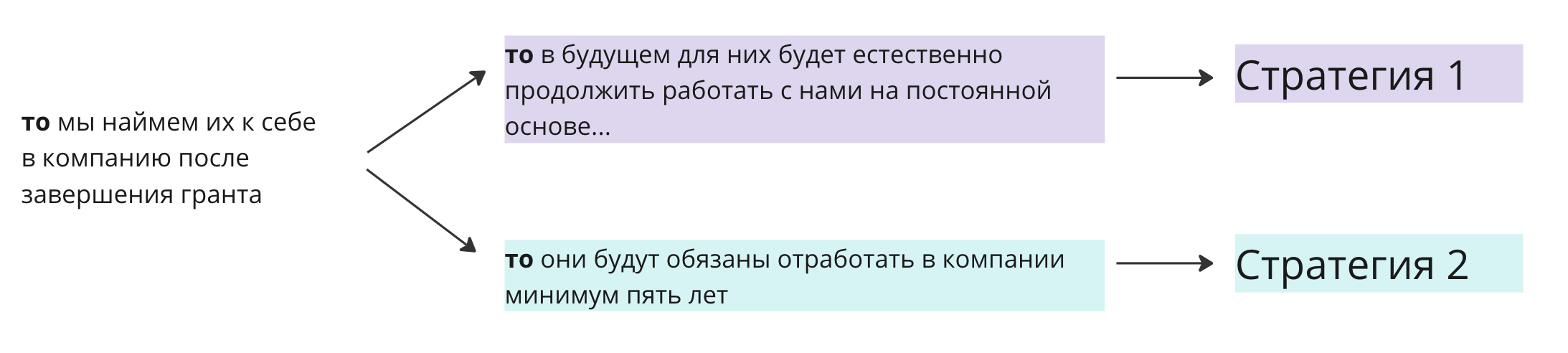 Такое «то» корректирует базовую идею и меняет задачи. Обратите внимание, что оба «то» подходят под «мы наймем их к себе в компанию после завершения гранта», но базовые идеи и задачи при этом абсолютно разные, а значит будет и разная стратегия работы: