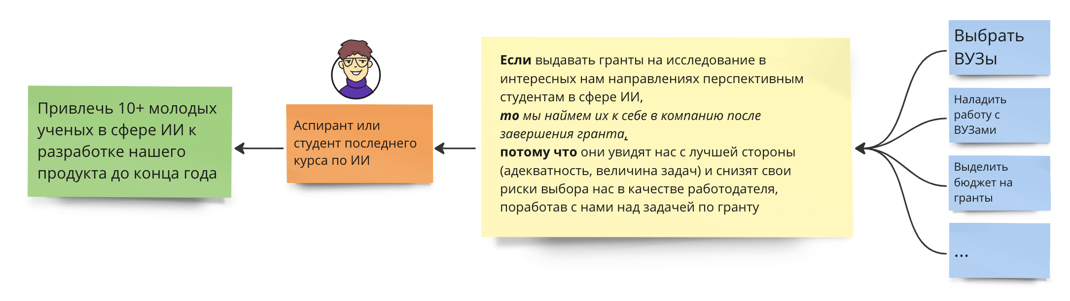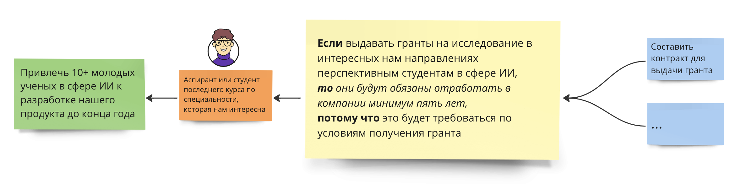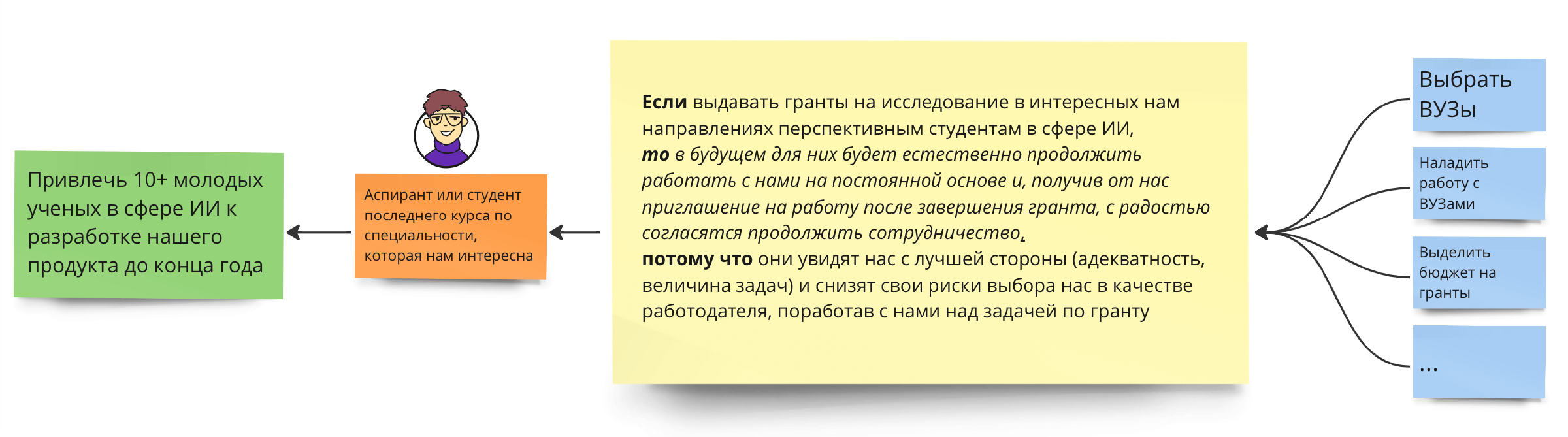 В этом варианте мы изменили только «то» и теперь стало ясно, как мы хотим поменять их жизнь. Если оставить первый вариант, когда было написано, что «мы наймем их себе в компанию», то мы не раскроем суть действия, которое должен совершить субъект. В исправленной гипотезе стало явно видно, что мы надеемся на то, что для студента будет естественно продолжить работу с нами. Почему это так важно? Потому что тот, кто составляет Карту гипотез должен абсолютно точно указывать все причинно-следственные связи и свои идеи. Представьте себе, что в «то» было бы написано: «то они будут обязаны отработать в компании минимум пять лет». Это совсем другое следствие выдачи гранта. Тогда в «потому что» может быть: «это будет требоваться по условиям получения гранта»:
