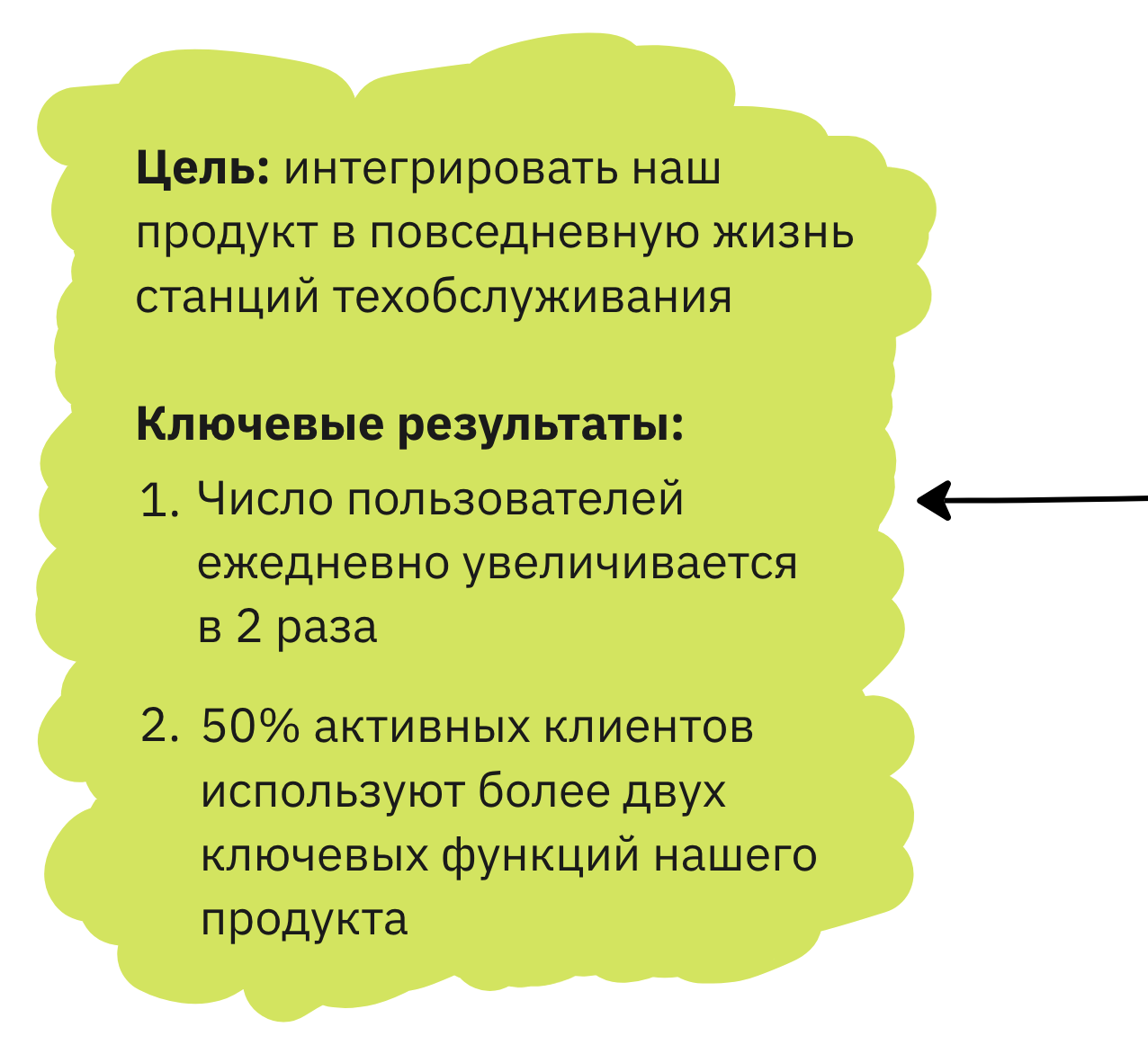 - Ключевые результаты — это набор метрик, с помощью которых мы можем оценить, движемся ли мы к цели.