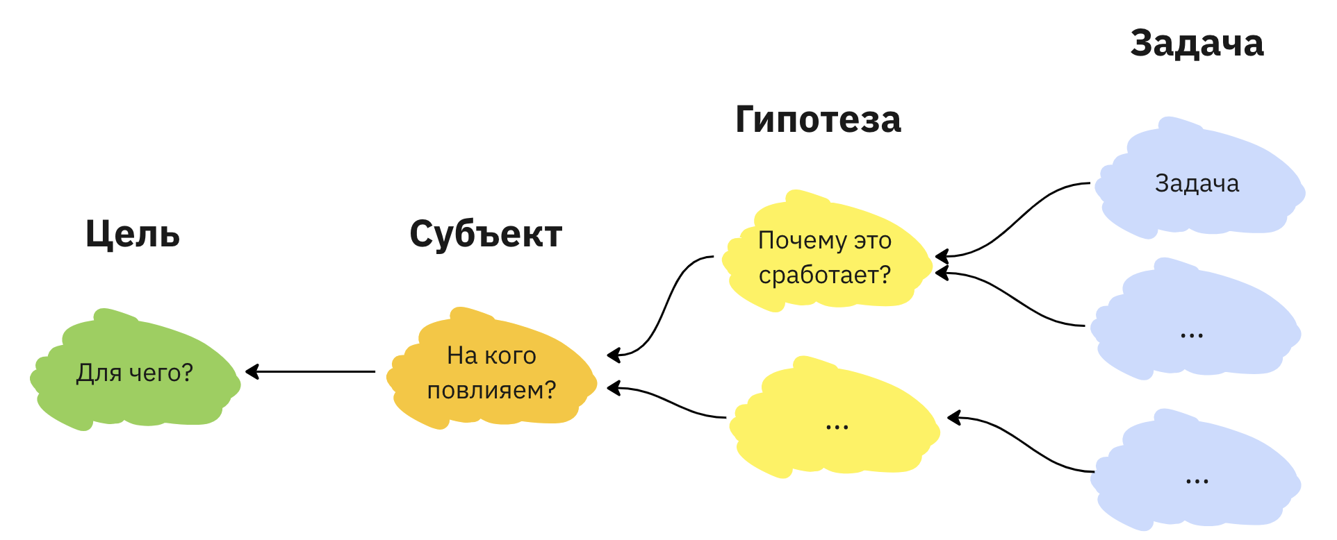 Верхнеуровнево Карта гипотез выглядит как майндмап, составленный по определённым правилам: