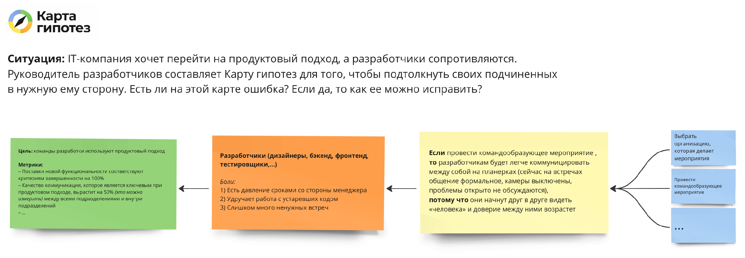 Но перед публикацией видео, я предложил подписчикам канала о Карте гипотез порассуждать на эту тему и написать свои варианты в комментариях. Перейдите по ссылке и для начала почитайте, какое решение предложили практики этого метода.