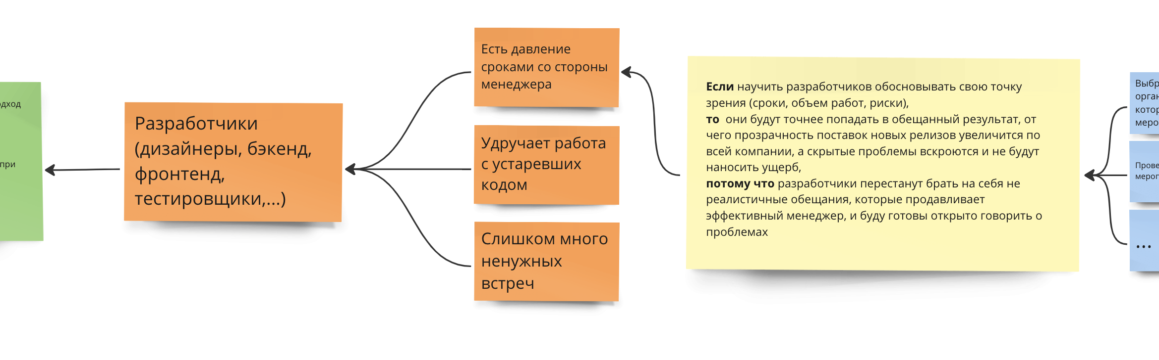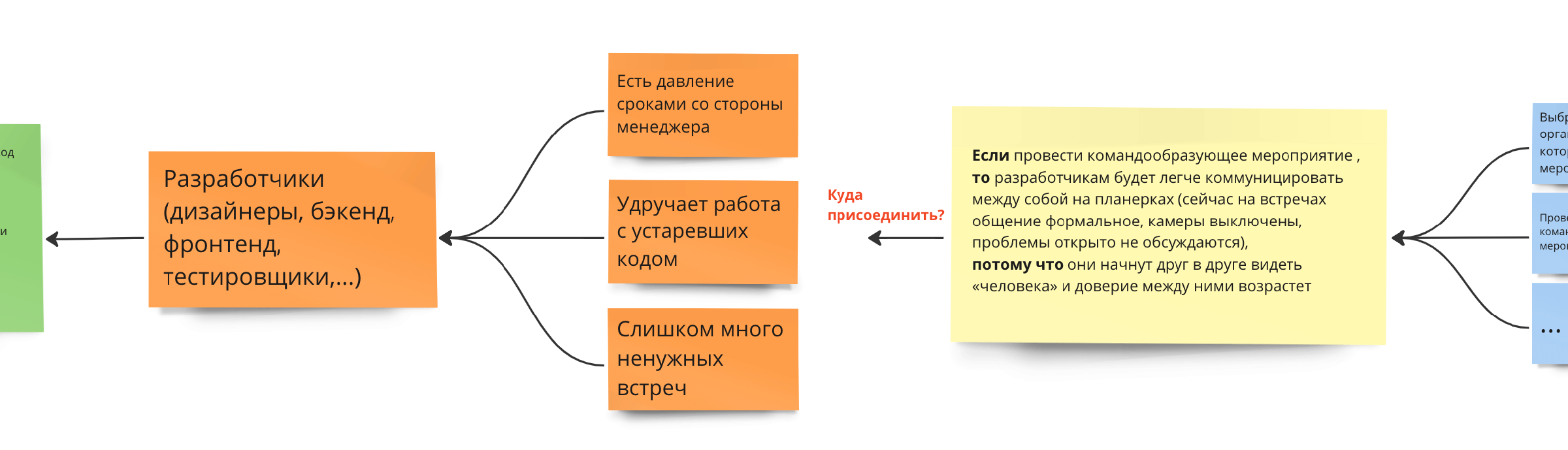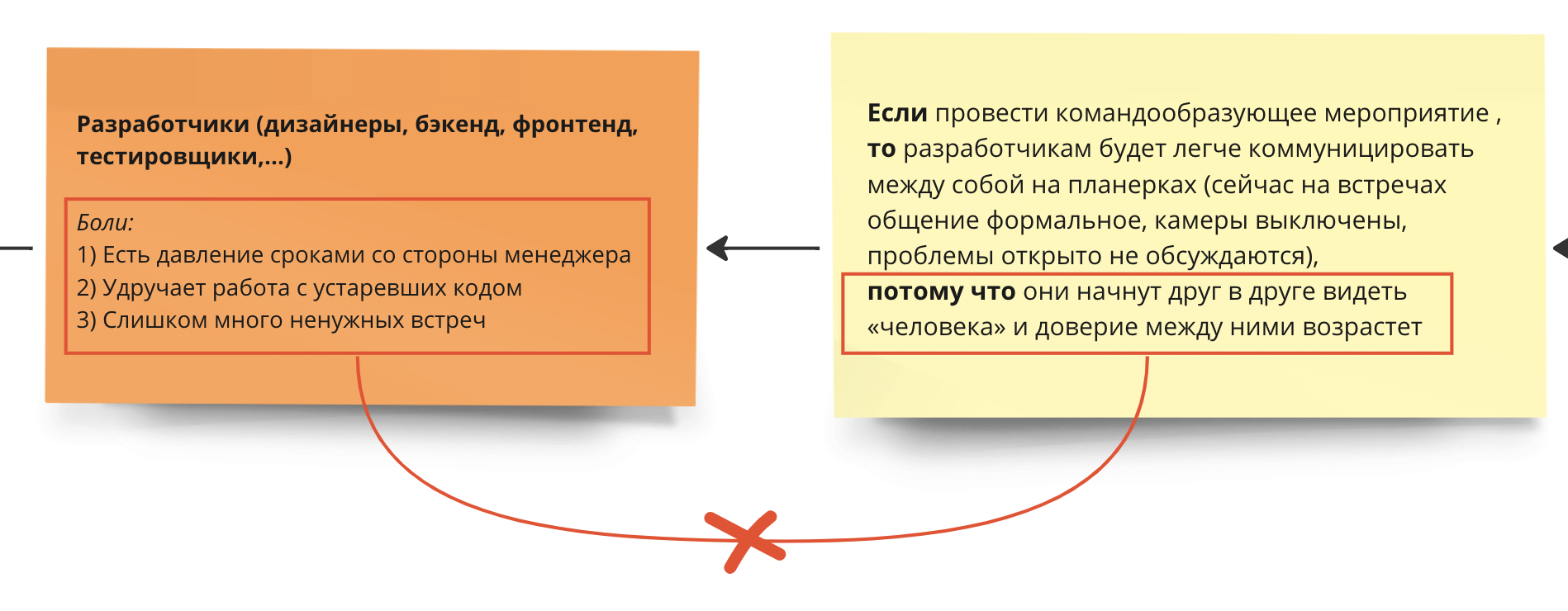 Теперь смотрим на мотивацию разработчиков, которая описана в разделе про боли субъекта. Разве им сейчас хочется, чтобы доверие между ними возросло? Нет, у них нет такой проблемы. Это проблема руководителя, но гипотезу мы пишем не про него.