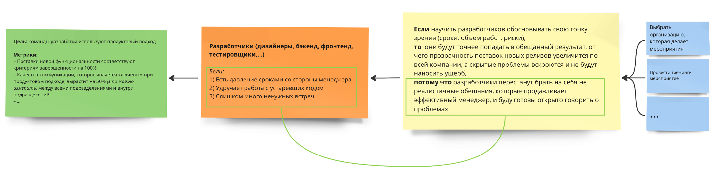 Теперь наша гипотеза явным образом связана с болями субъектов, а значит появляется шанс повлиять на субъект и прийти к том, что мы записали в целях.