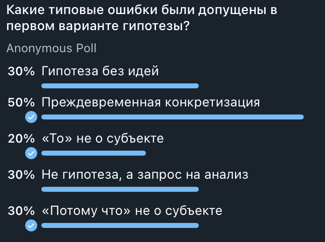 Но перед публикацией видео, я предложил подписчикам канала о Карте гипотез проголосовать за то, какую ошибку из списка типовых ошибок, они заметили в примере. Вот результаты голосования: