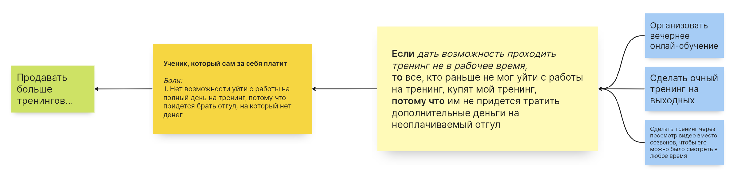 Давайте рассмотрим на примере каждый шаг в алгоритме. У нас будет Карта гипотез по продаже тренингов: