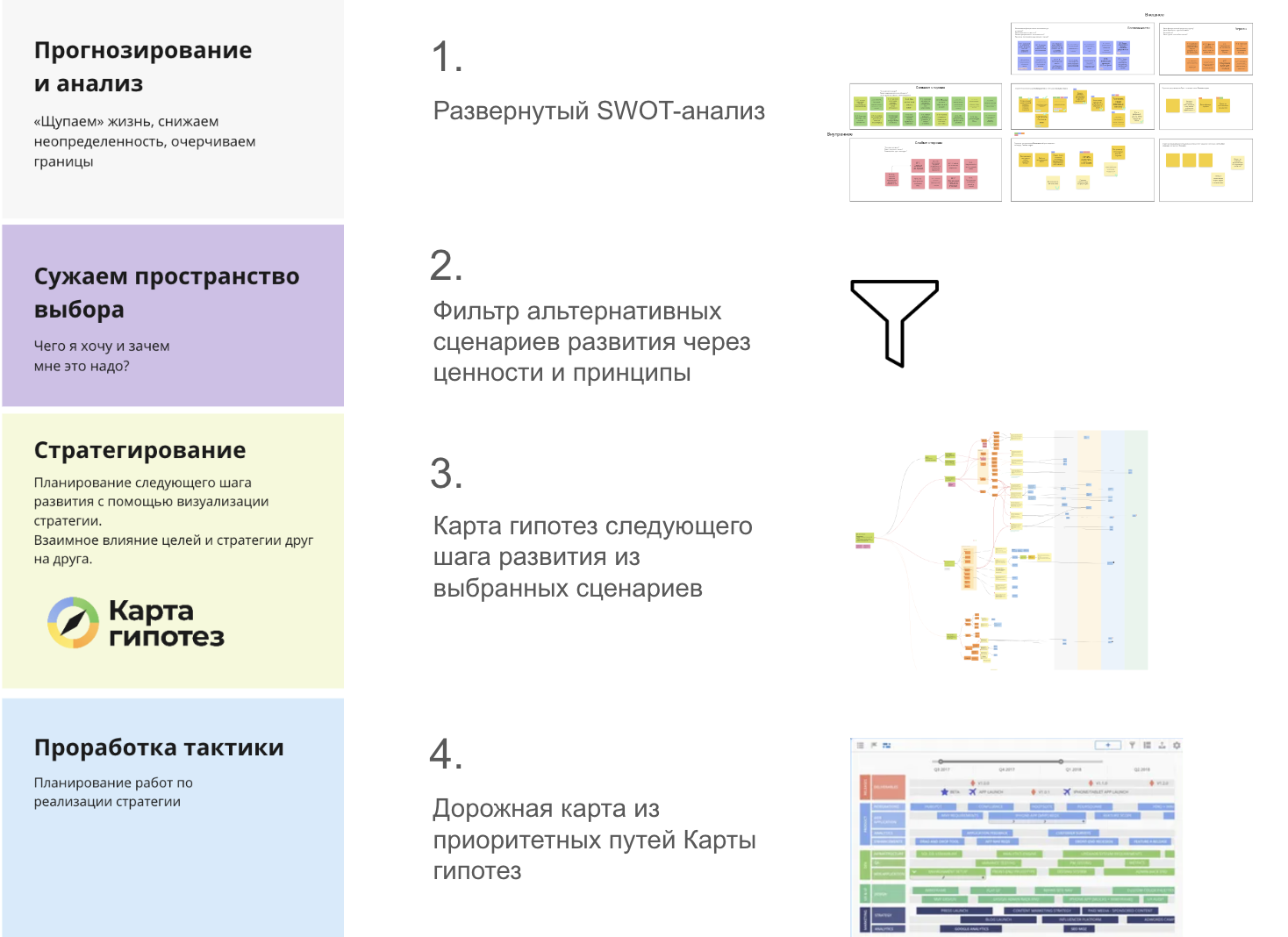 Мы рассмотрим подробно и с примерами, как используется каждый метод. В конце статьи есть видеоурок, где я показываю, как это всё используется на сессиях стратегического планирования.