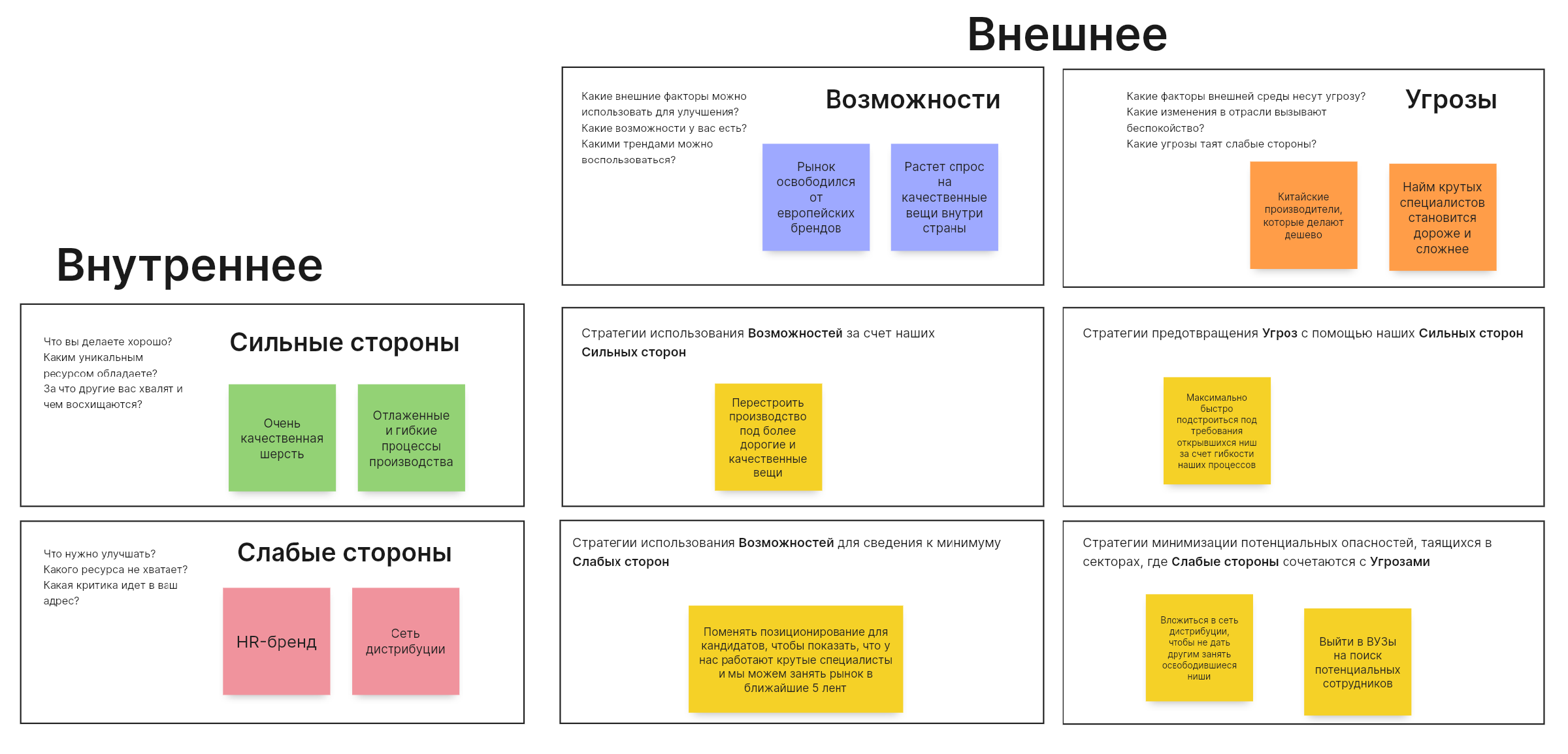 В качестве обучающего примера давайте используем этот метод для компании, которая производит в России зимнюю одежду. Представьте себе, что сотрудники этой компании собрались для прогнозирования будущего и анализа текущей ситуации. Описали свои сильные и слабые стороны, изучили тренды и заполнили возможности и угрозы. Дальше они постарались придумать идеи на пересечении внешних и внутренних факторов и записать их в желтые карточки.