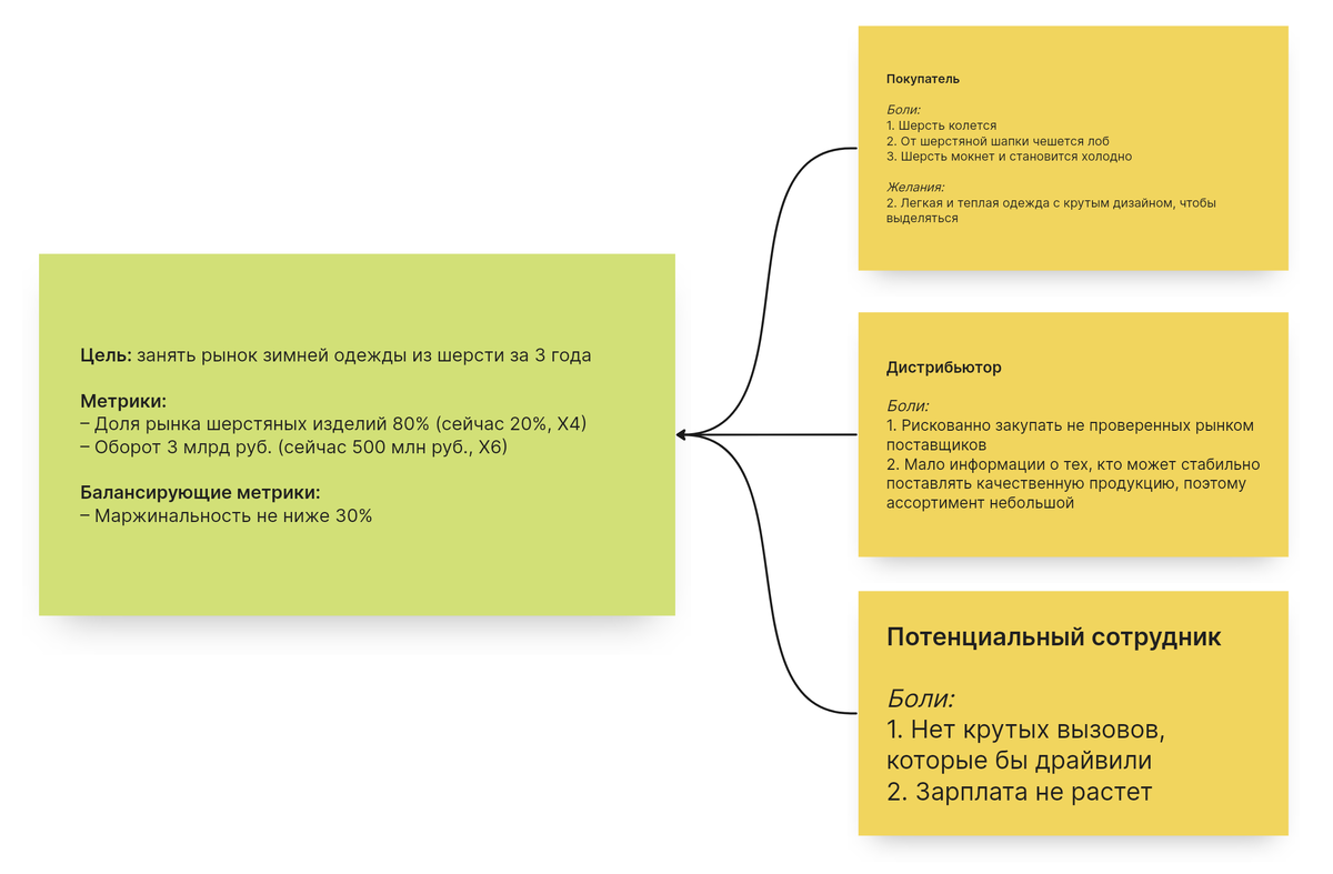 На схеме для начала записана цель с метриками и субъекты с мотивацией.