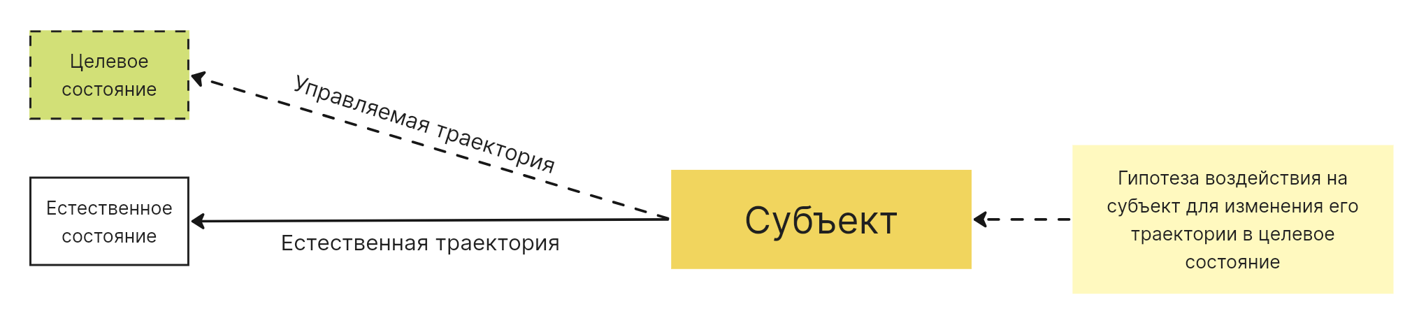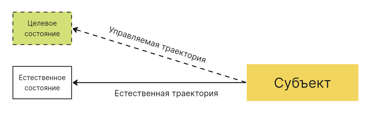 Такое положение дел нас не устраивает, потому что мы хотим достигнуть определенных целей. Если мы занимаемся управлением, то хотим изменить естественную траекторию субъекта на другую, ценную для себя:
