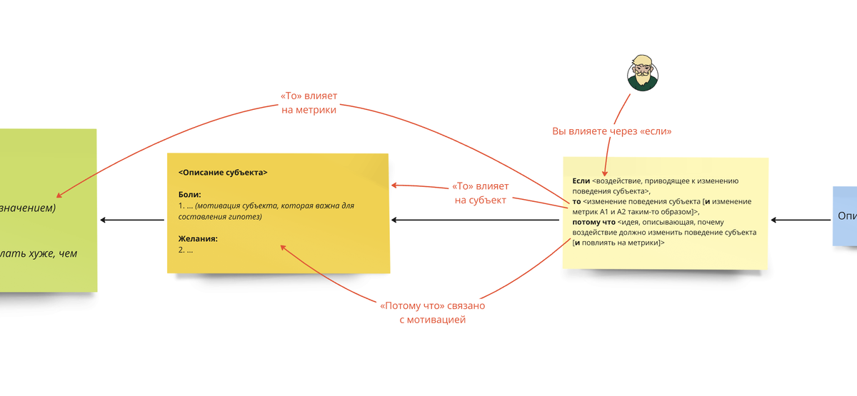 Гипотеза в Карте гипотез состоит из трех частей: если, то и потому что. Каждая часть связана с другими частями карты: