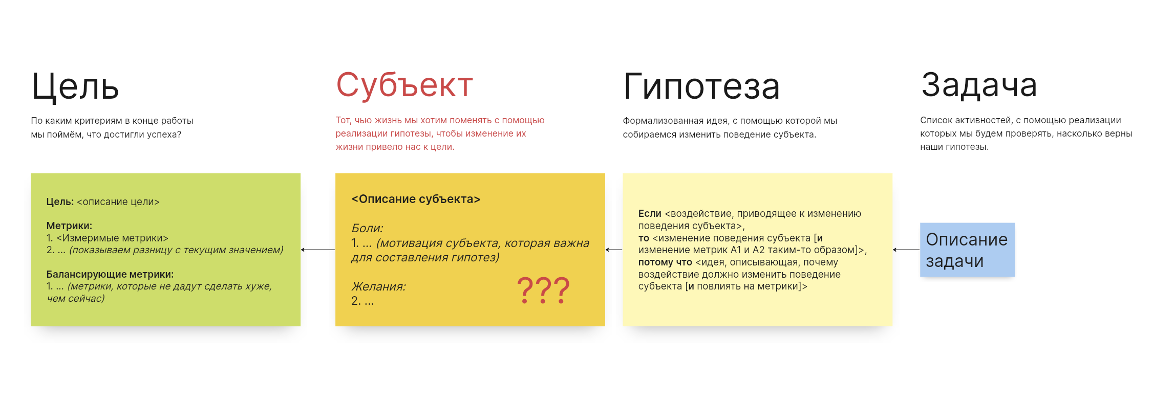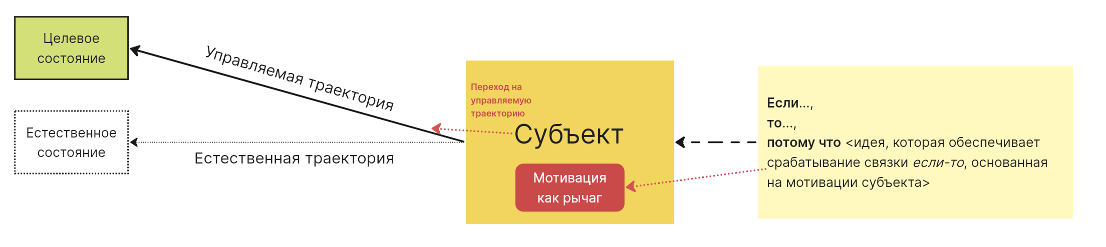 Нас в данный момент интересует только нижняя стрелочка, которая соединяет потому что и мотивацию субъекта. Чтобы гипотеза сработала, нужно знать мотивацию субъекта, тогда появляется шанс придумать управляемый механизм изменения траектории: