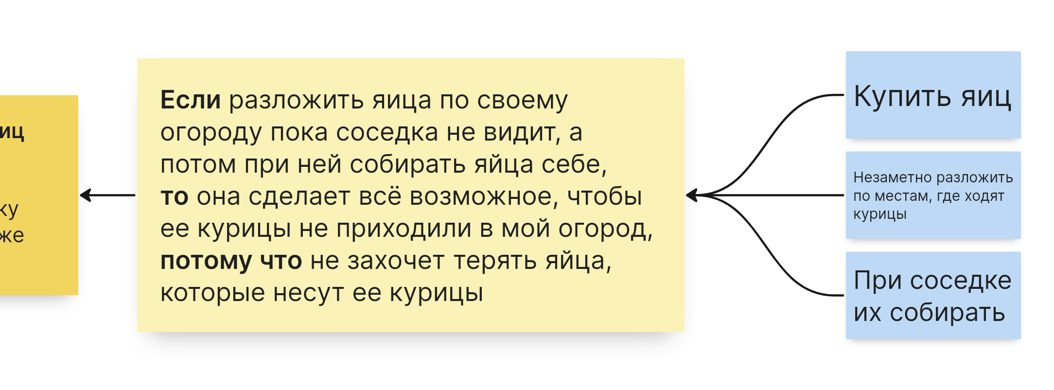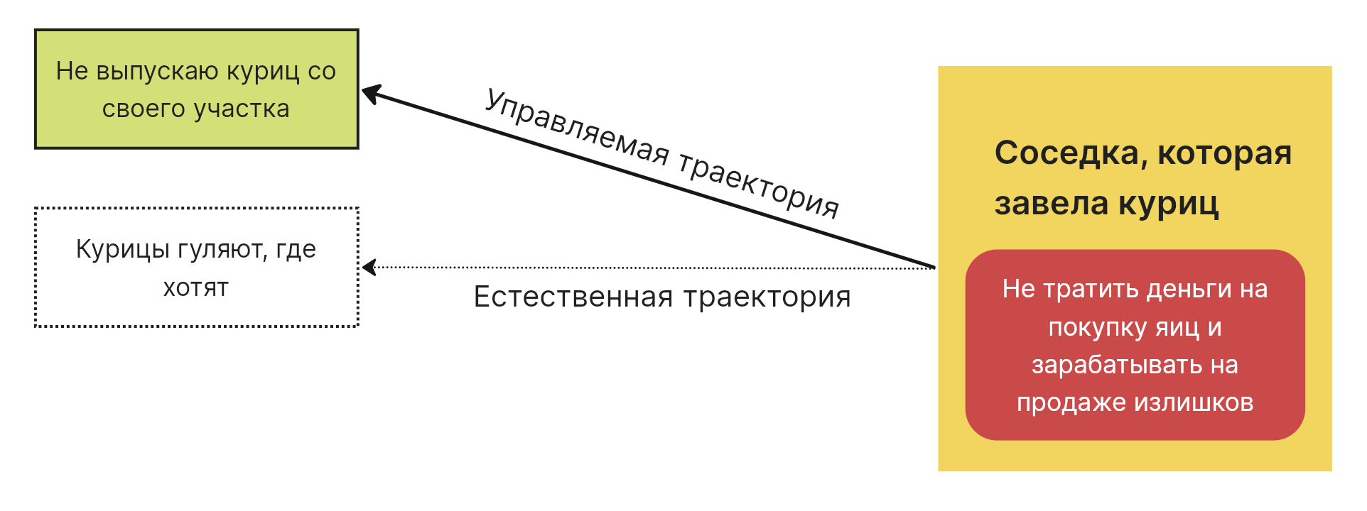Механизм срабатывания этой гипотезы, описан в потому что и основан на мотивации субъекта – соседка не захочет терять яйца, а значит сама сделает всё возможное, чтобы ее курицы не появлялись в вашем огороде.