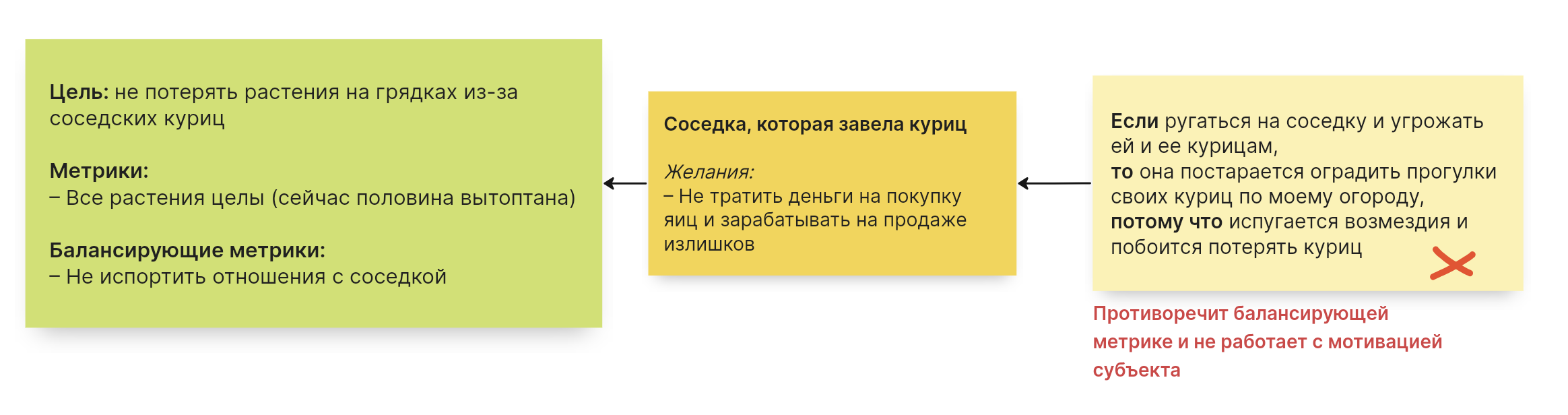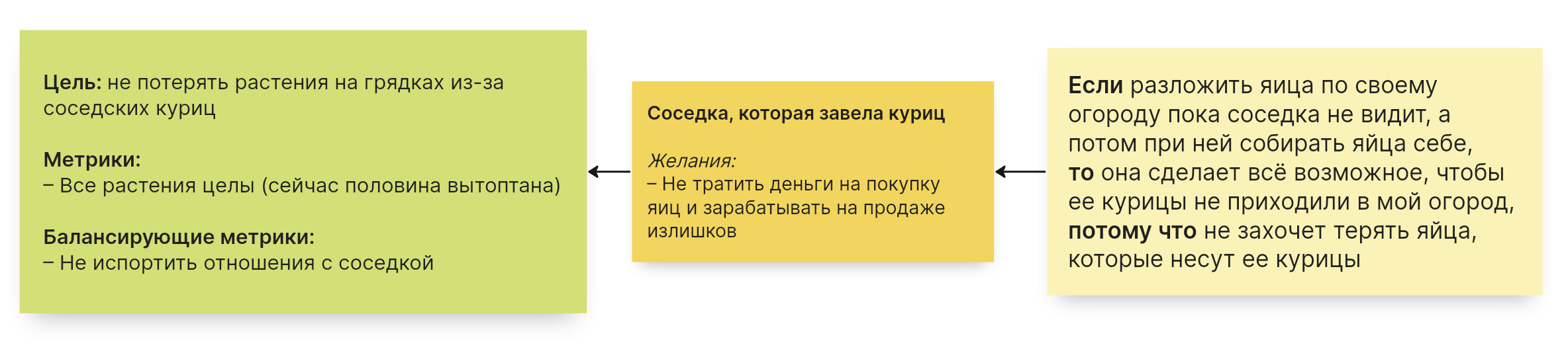 Разберем создание стратегии, основанной на мотивации субъекта, на простом житейском примере. Представьте, что вы живете на даче и ваша соседка завела куриц для того, чтобы есть свежие яйца и продавать излишки. Эти курицы не ограничиваются участком соседка, а бегают по вашему огороду и вытаптывают растения на грядках. Ругаться с ней не хочется, чтобы не испортить отношения, но и терять свои посадки не хочется.