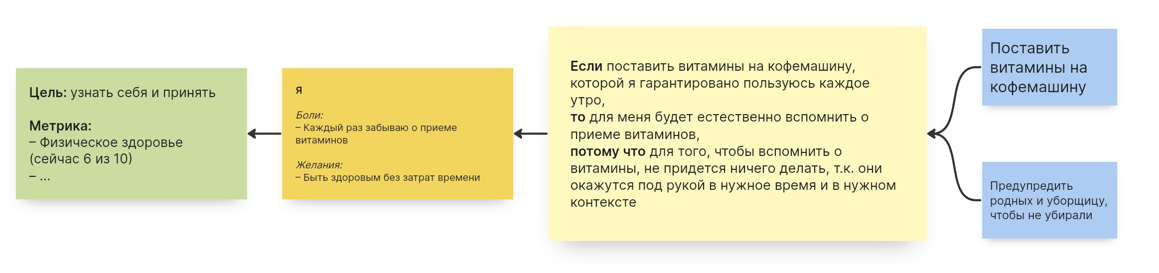 Например, вы хотите быть здоровым и решили принимать витамины. Но вы жутко заняты и немного рассеяны, поэтому никак не можете себя организовать. Тогда вы можете решить сами себя подтолкнуть в нужную сторону за счет гипотезы:
