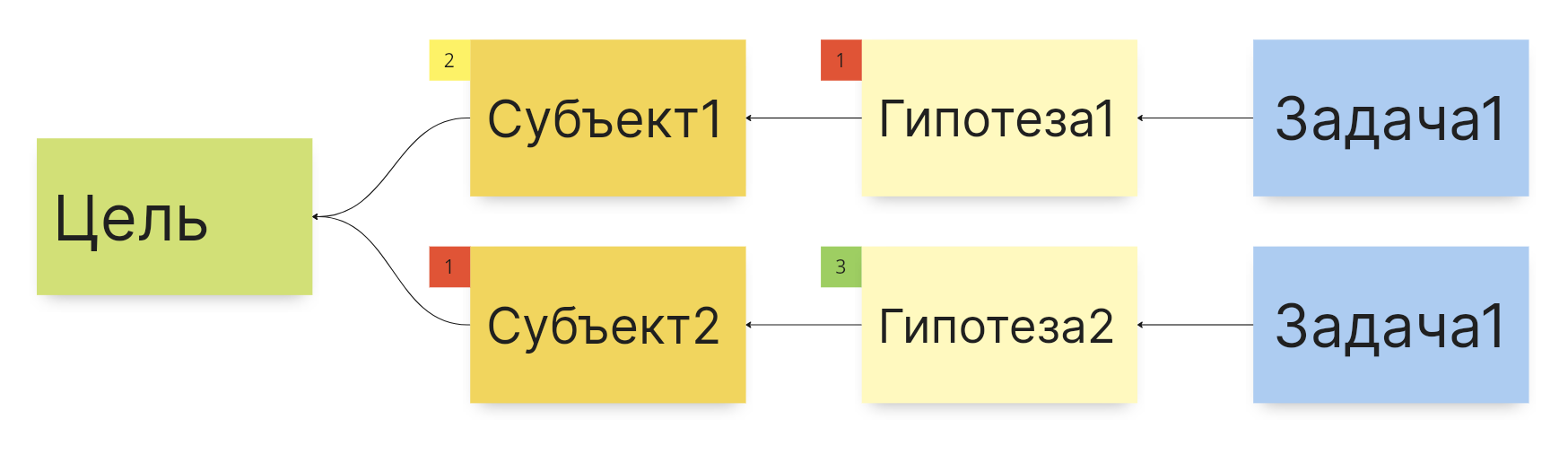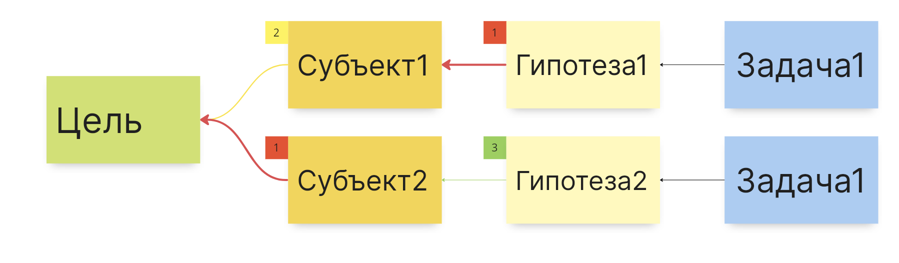 Не надо вдаваться в детали того, что будет написано внутри элементов. Даже без содержания уже видно, к приоритетной метрики идет слабая цепочка из субъекта и гипотезы. Это значит, что нам не хватает еще субъектов и гипотез для того, чтобы эту метрику достигнуть. Что в свою очередь означает, что нужно продолжать стратегировать.