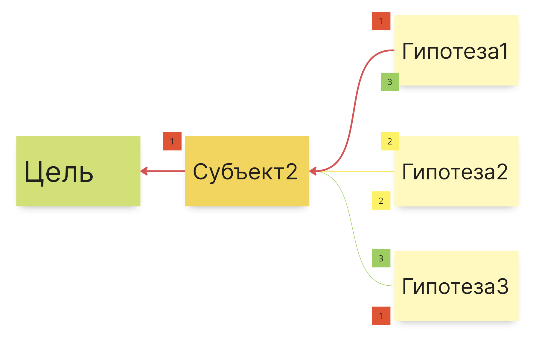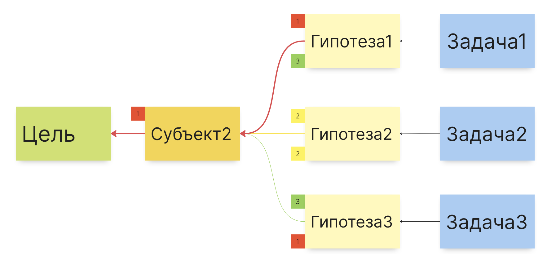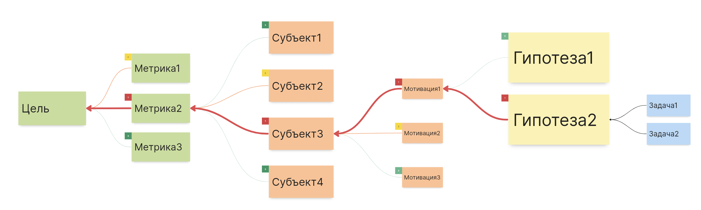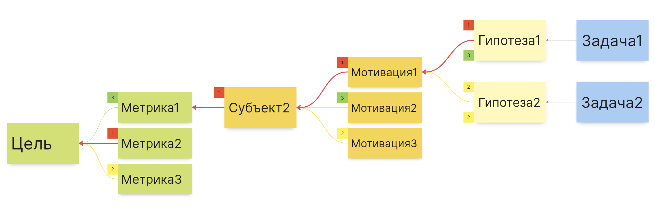 Здесь видно, что очень важной для достижения цели является Метрика2, поэтому она обозначена красной цифрой 1 и от нее идет толстая красная стрелка к цели.